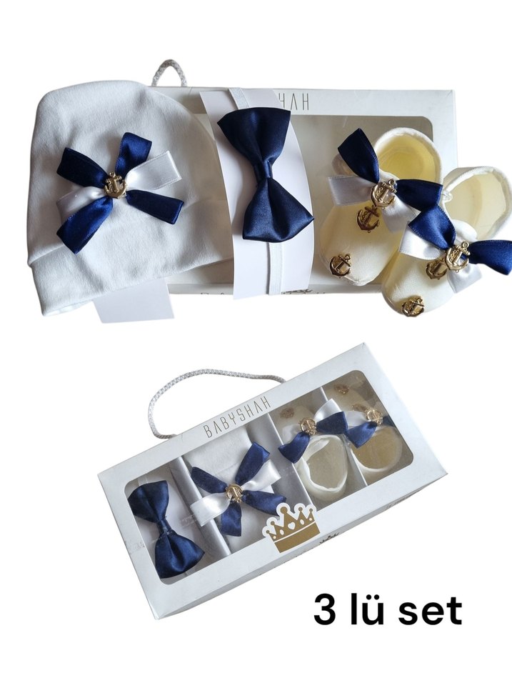 3 parça papyon patik şapka özel kutusunda 0-3 ay arası giyebilir