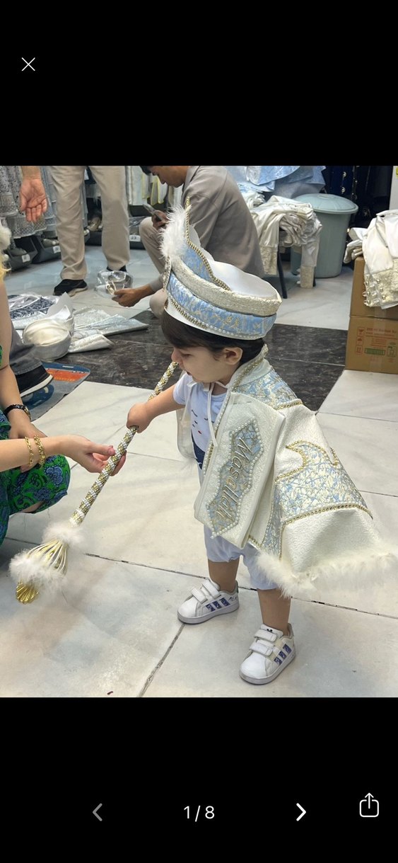 Krem/mavi tonlarda gold detaylı tüylü şapka, asa, kemer, Maşallah ve pelerin seti. Özel günlerde ve fotoğraf çekimlerinde kullanıma uygundur. Bu yaş grubu için pelerinli takım çok zor bulunuyor özel üretim almıştık. Sadece fotoğraf çekimi için kullandık yeni gibi (özellikle şapkanın içini de çektim beyaz satenlerinde hiçbir sararma leke vs yoktur) biz 15aylıkken kullandık 1-3 yaşa olur sanırım. Zaten boyundan kurdeleli, kemer de lastikli ayarlanabilir. not: pelerin çok ağır boncuk süsleme içermez, diğer şatafatlı pelerinler büyük çocuklar için oluyormuş. Satıcı bu yaş grubu taşlılar ağır olduğu için taşıyamaz, hafif süs malzemesi kullanıldı demişti. Süslemeleri çok yüksek kalitede değil ama fotoğraf için yeterli oluyor, kötü gözükmedi. fiyatı zaten diğer işçiliği kaliteli olanlardan uygun tutuyorum)