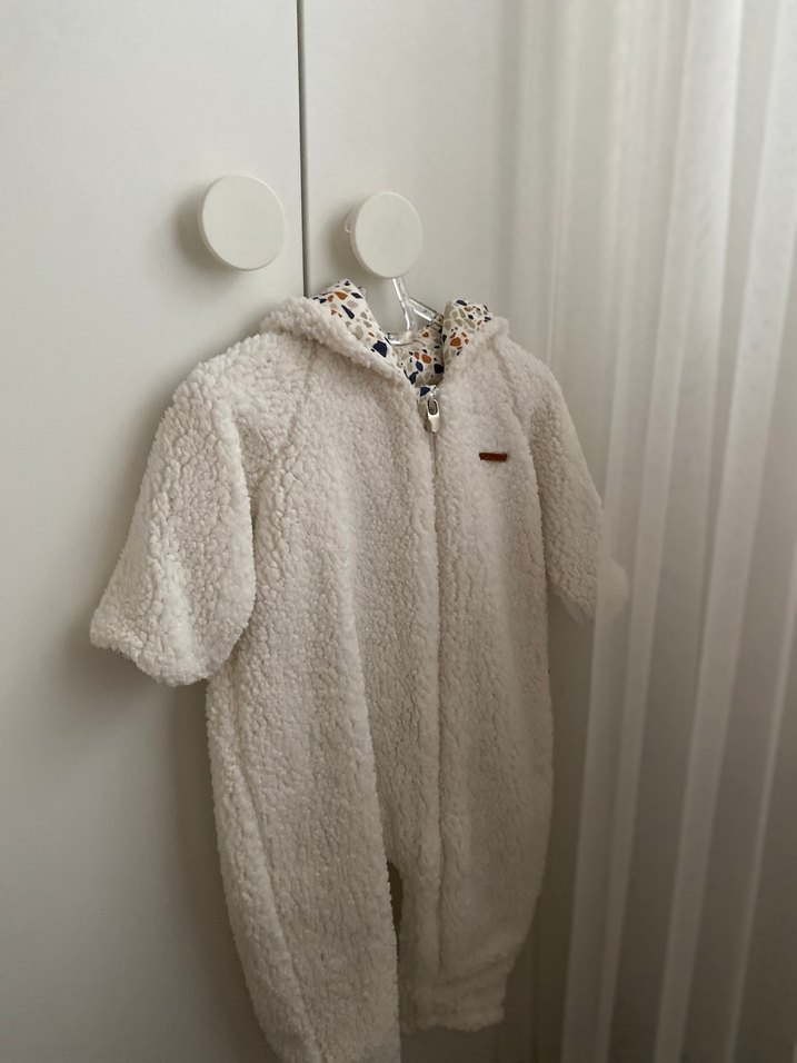 Yumuşak kürk detaylı beyaz peluş astronot tulumu, kapüşonunda renkli desenli astar bulunur, sıcak tutar temizdir markası Little Gusto organik pamuktan üretilmiştir