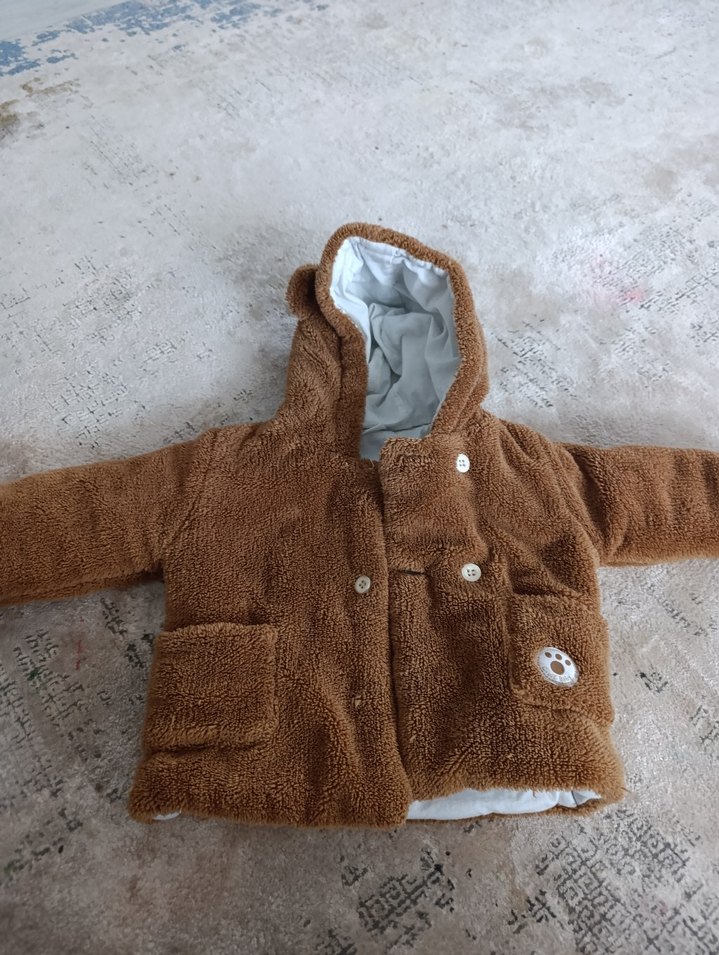 Kahverengi, peluş kumaştan yapılmış, kapüşonlu ve cepli bebek montu. Rahat kesimi ve pençe desenli detaylarıyla sokak stiline uygun. düğmeli 9/12 ay civil marka deformesi yok içinde hafif bı leke var bebek şampuanı çıkarmadı ekstra leke çıkarıcı vs sürmedim kimyasal deterjanla yıkanırsa geçebilir ama kullanıma engel değil