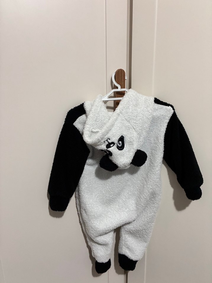 Beyaz ve siyah renklerde, örme dokulu ve panda baskılı bebek tulumu. Yumuşak ve sıcak Peluş günlük kullanım için uygun.