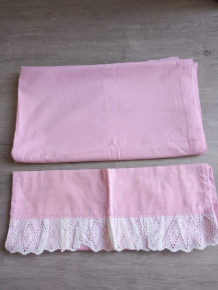 Pastel pembe renkte, beyaz dantel nakış detaylı kenarlara sahip yumuşak ve şık nevresim takımı çarşaf boy:180cm en : 80cm yastık kılıfı boy:42 cm en:60 cm sıfır üründür.