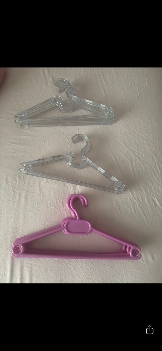 Pembe plastikten yapılmış, sağlam yapılı askı. Giysiler için uygun, pastel pembe renkte.