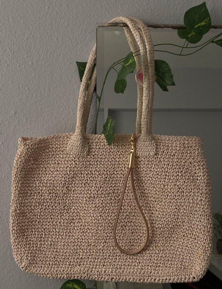 pembe renkli, yumuşak örgü kumaştan yapılmış bohem tarzda kadın çantası. Uzun kulplu ve desensiz, günlük kullanım için uygun. pembe simli charm dahil. sıfır ürün
