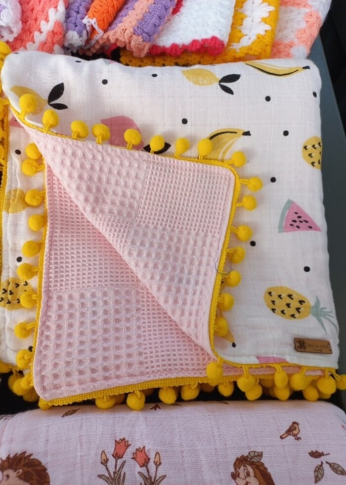 Çift taraflı bir tarafı Müslüm bir tarafı pike kumaşı 90'a 90 ölçülerinde kendim bitiyorum