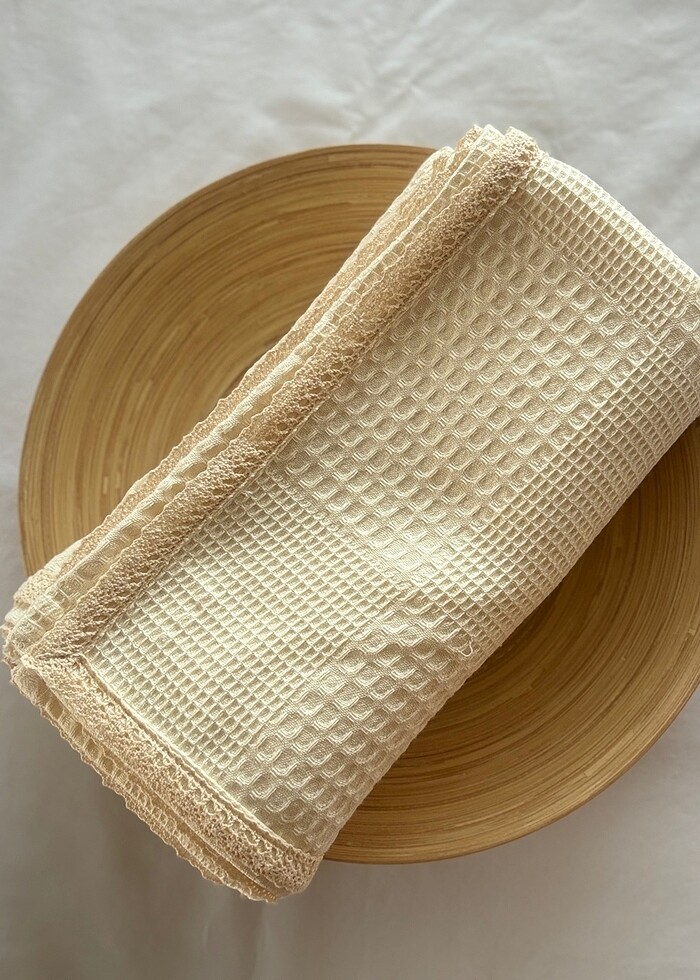 Krem rengi kenarı dantel detaylı bebek pikesi