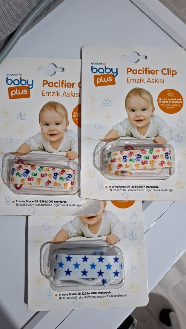 Bebek Plus emzik askısı, farklı renkli desenlerle, EN 12586:2007 standartlarına uygun olarak emziği güvenli ve temiz tutar.