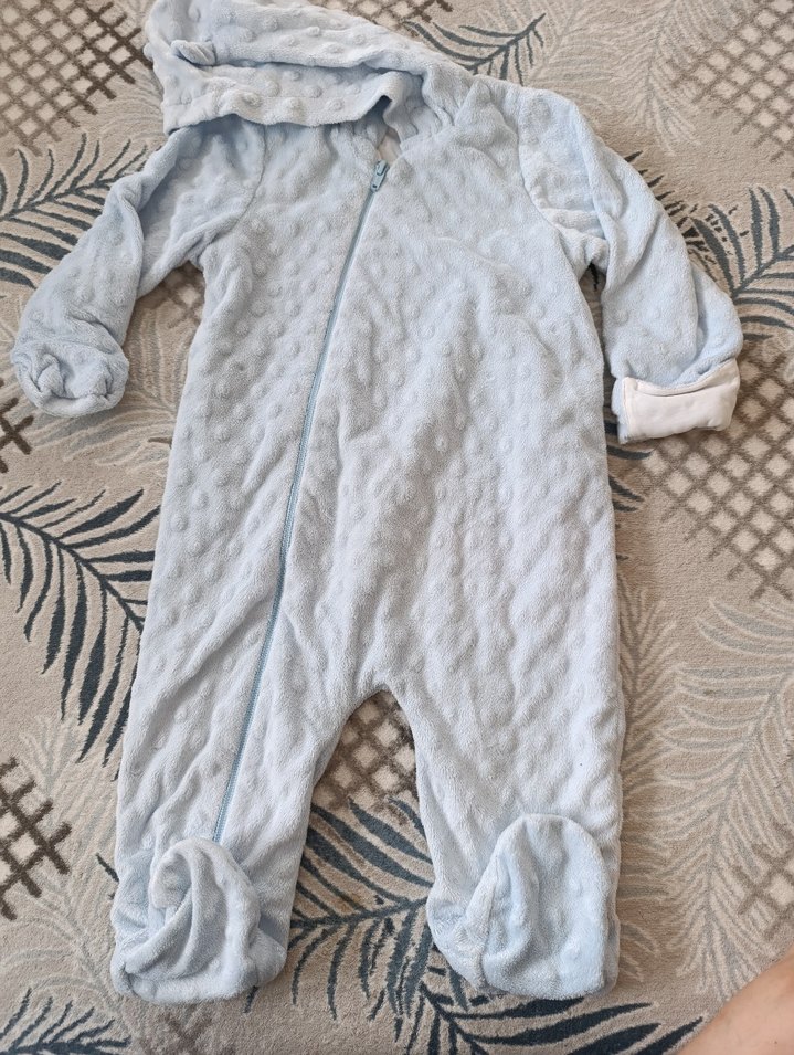 Yumuşak ve sıcak mavi polar bebek tulumu, önden fermuarlı ve kapüşonlu. Rahatlık ve kolay giyim için tasarlanmıştır. Sokak stiline uygun.