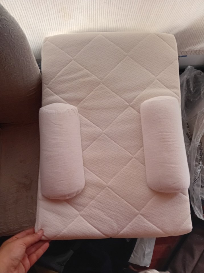 Yumuşak, kapitone yüzeyli beyaz reflü yastığı. Yenidoğan için çok kullanışlı, sorunsuz ve temiz.