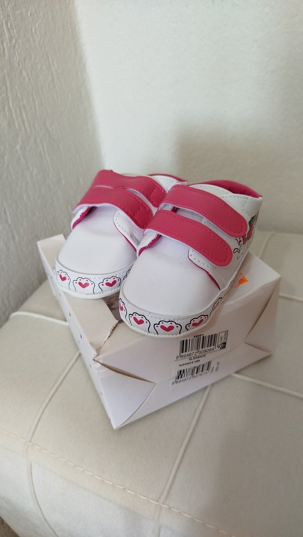 Kız bebekler için renkli baskılı, pembe cırt cırtlı ve kauçuk tabanlı ilk adım ayakkabısı.