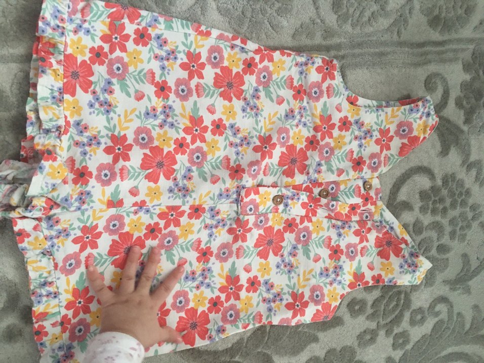 Çiçek desenli, kolsuz kız salopet tulum. V yaka ve düğmeli ön detaylı, bol kesim, hafif sentetik kumaştan üretilmiştir. Bohem tarzına uygundur. Cok tarz az temiz kullanilmis .