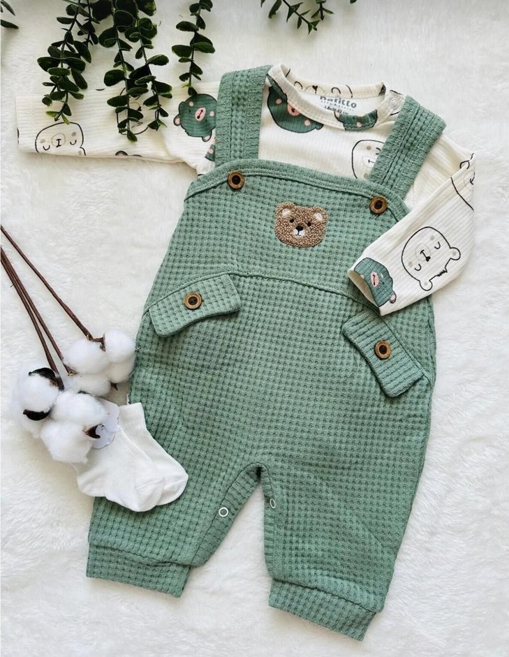 Ayıcık Detaylı %100 Pamuklu Bebek Takımı Yumuşacık dokusu, sevimli ayıcık detayı ve rahat kalıbıyla miniklerin hem şıklığı hem konforu bir arada. Çorap hediyeli Günlük kullanım için ideal, hassas ciltlere uygun Etiketiyle gönderilecektir. Şapkası yoktur. sadece salopet, çıtçıtlı badi ve çoraptan oluşmaktadir.