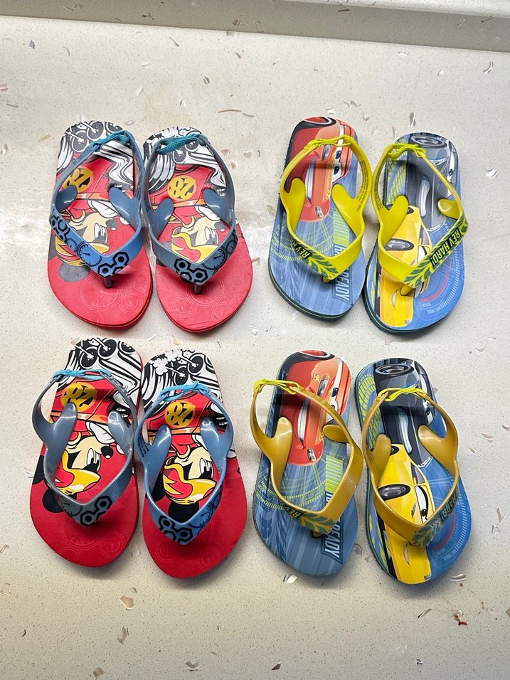 Renkli bağcıklı kayışlara ve bağlama boyası desenlerine sahip kauçuk çocuk terlikleri, bohem ve retro tarzını yansıtıyor.