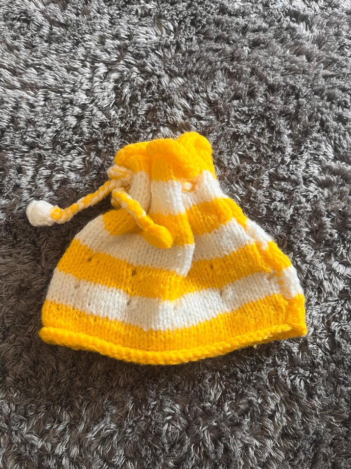 Bebekler için sarı ve beyaz çizgili, örgü tasarımlı, rahat ve renkli bohem tarzda bere. El örgüsüdür hiç kullanılmadı yenidoğana uygun