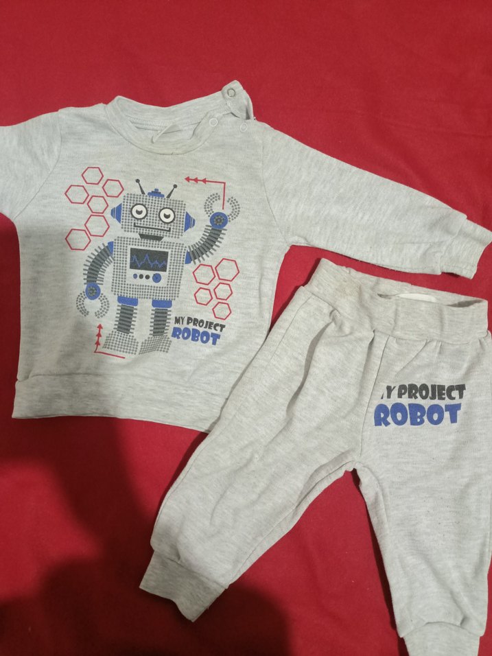 Gri renkli, uzun kollu, yumuşak kumaştan yapılmış bebek takımı. Üstte baskılı robot deseni ve alt pantolonda "YPROJECT ROBOT" yazısı bulunur. Kusurlar resimlenmistir.