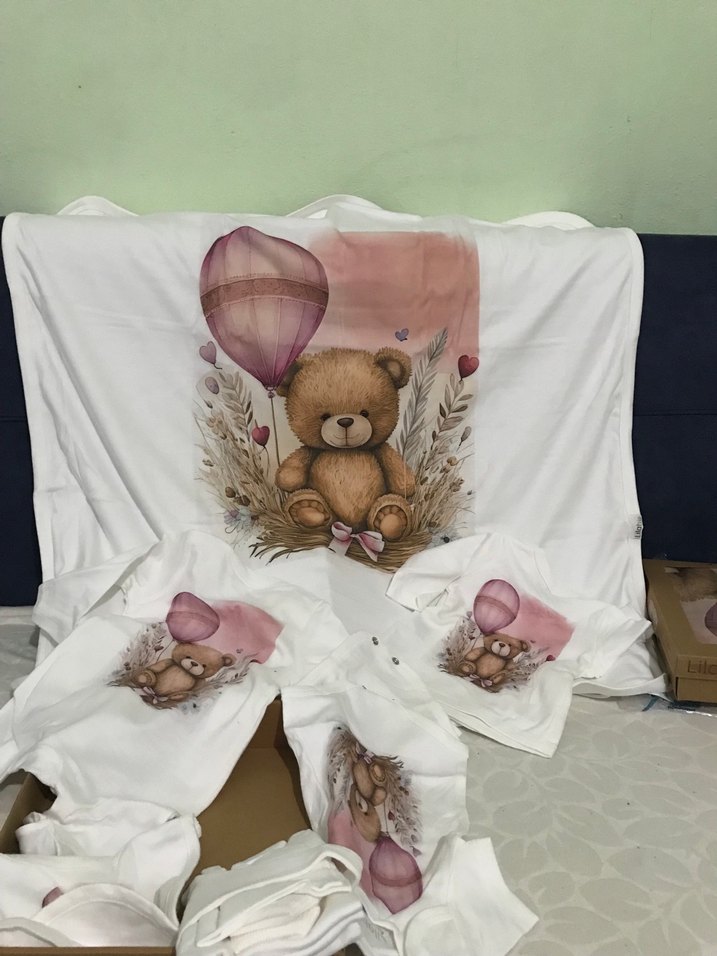 Pastel baskılı ayıcık ve balon desenli, beyaz renkte yumuşak sentetik kumaştan çocuk uyku seti.
