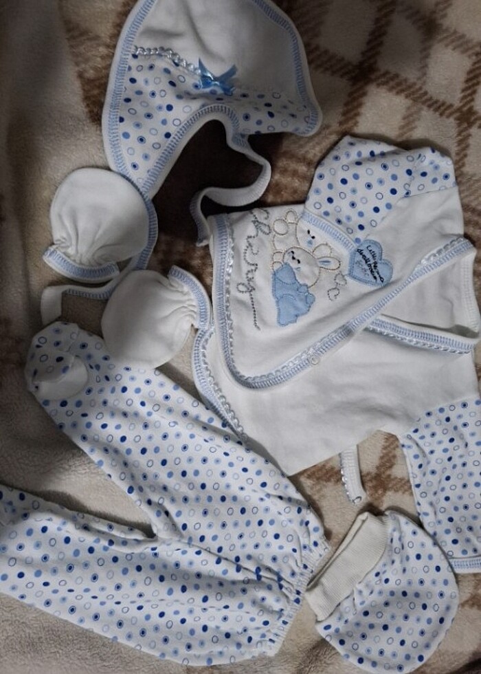 Takım halinde sıfır hiç kullanılmadı etiketi yok sadece. Yüzde yüz pamuktur yeni doğan kıyafeti
