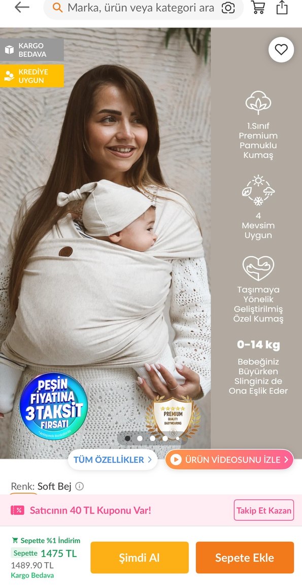 Pamuklu premium kumaştan üretilmiş, 0-14 kg bebekler için uygun, dört mevsim kullanıma elverişli özel taşıma slingidir. Bebek büyürken ona eşlik eder. Hiç kullanılmadı . Daha yeni aldım.Hiç kullanılmadı. Farklı rengini kullanmayı tercih ettik