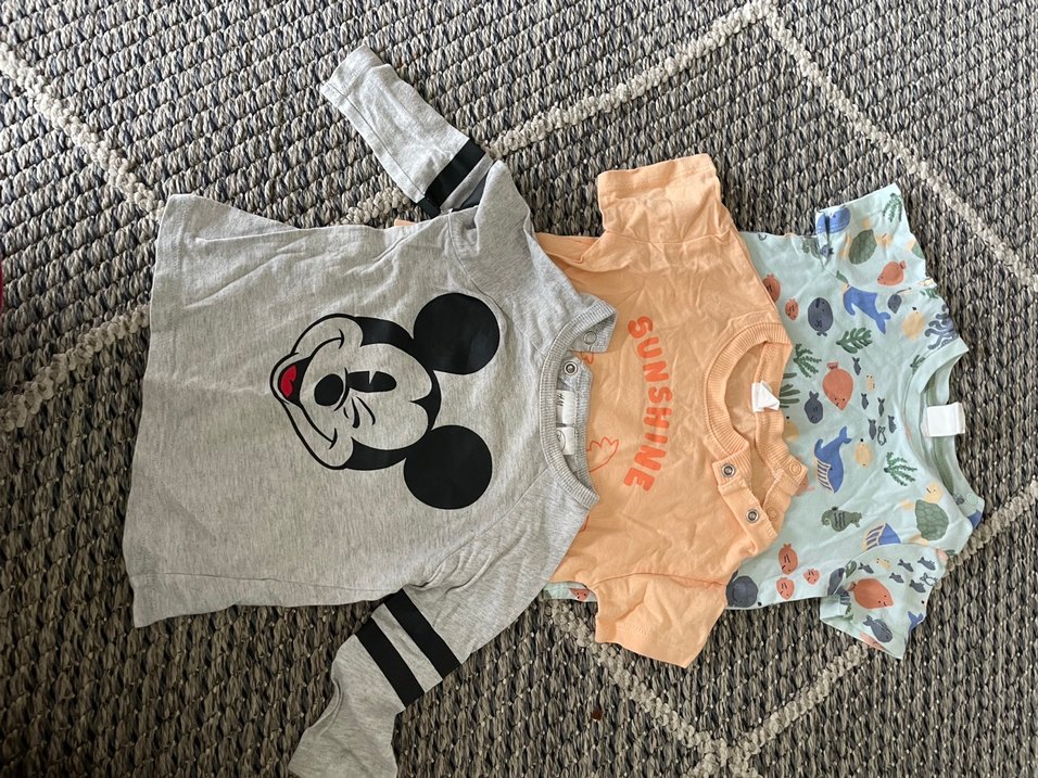Gri renkli, kısa kollu, Mickey baskılı bebek body. Ve pek çok farklı modelde. Pamuklu kumaştan üretilmiş, düğmeli ve yuvarlak yaka tasarımıyla rahat kullanım sağlar. Lütfen almadan önce fiyatlarını sorunuz.