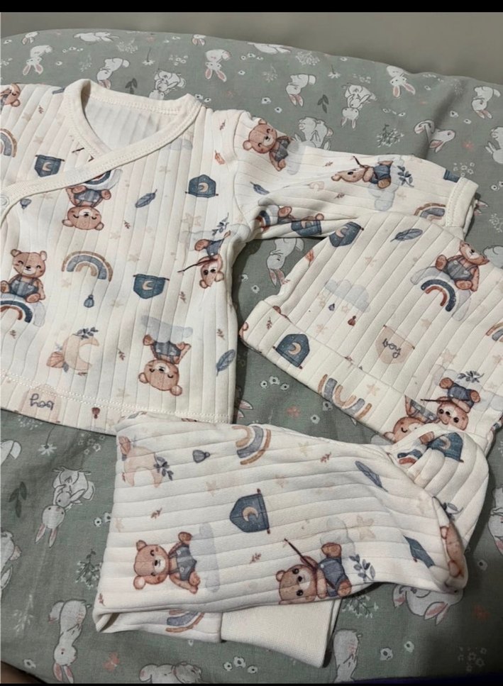 Bebek erkek triko pamuklu kumaştan, beyaz pastel renkte ve baskılı ayıcık desenlidir. Uzun kollu ve yuvarlak yakalıdır. 1-3 ay bedendir Hiç giyilmedi sadece yıkandı kaldırıldı