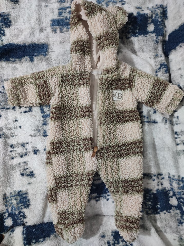 desenli bebek tulumu, kapüşonlu ve tam koruma sağlar, sıcak tutar. 56 sm, 0-3 aylık