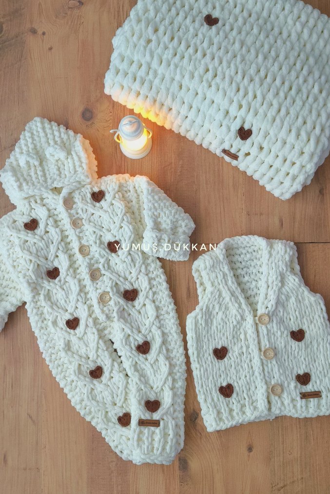 Nakışlı desenli beyaz örgü bebek kapşonlu tulum, kalp şeklinde düğmelerle süslenmiştir. Uzun kollu, kapşonlu rahat bir tarza sahiptir. Kalp detaylı yeleği de yanındadır.
