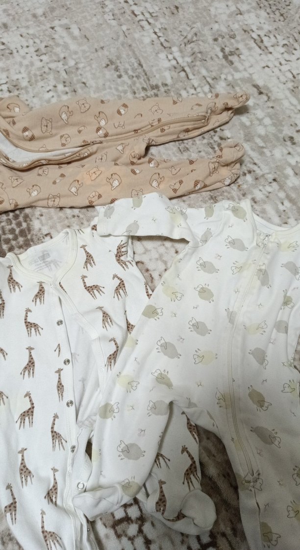 Baskılı hayvan desenlerine sahip bej ve pastel sentetik kumaştan yapılmış bebek uyku tulumları. Gece kullanımı için yumuşak ve rahat.