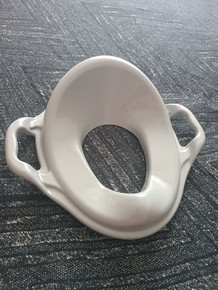 Beyaz bebek tuvalet adaptörü, kolay tutuş ve denge için kulpludur.