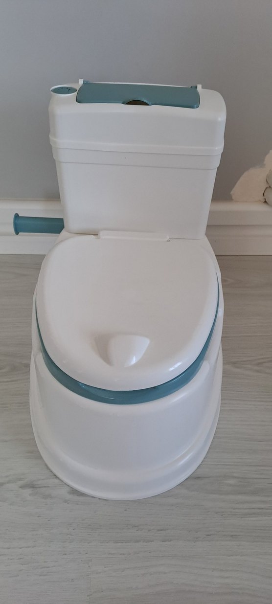 Bebekler için beyaz ve mavi renkli, kapaklı ve sifon kolu bulunan kompakt tuvalet eğitim seti. hiç kullanılmadı kendi kutusunda teslim edilecektir