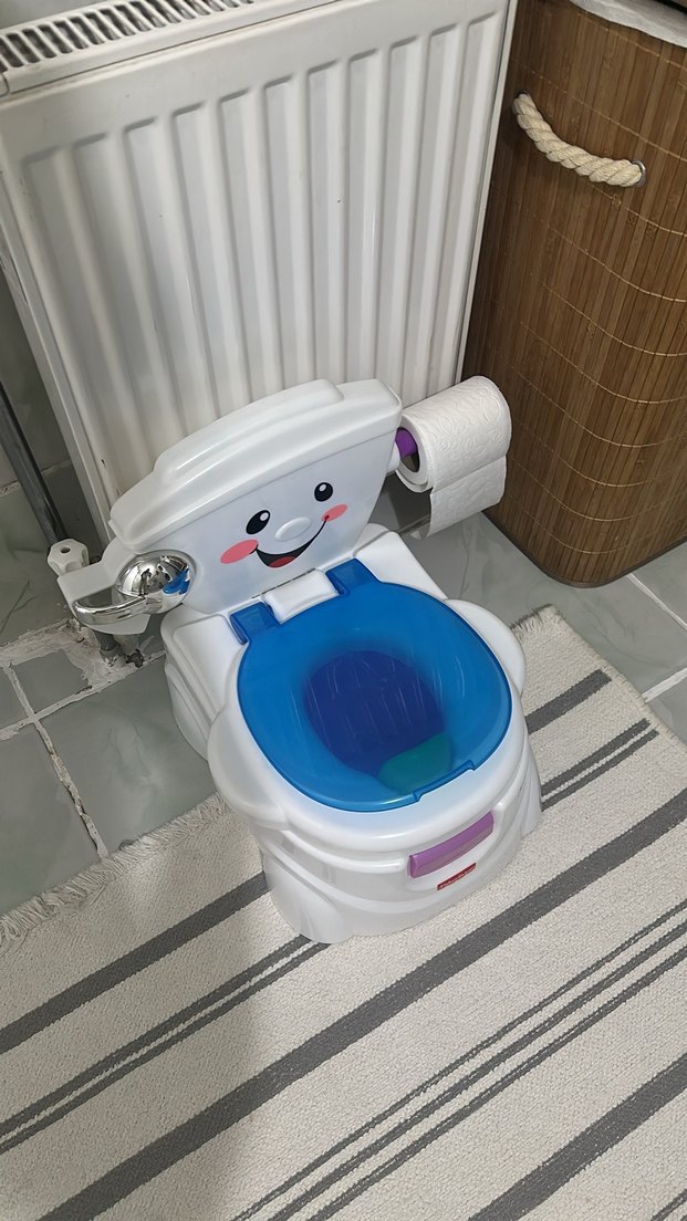 Müziği çalışıyor sorunsuz Gülen yüz tasarımlı, mavi oturağı ve yanında tuvalet kağıdı tutucusu olan bebek tuvalet eğitimi oturağı.