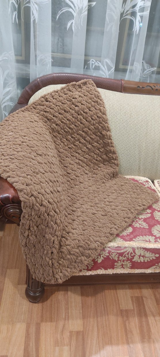 Dokulu örgü desenli, yumuşak el emeği çocuk ya da TV battaniyesi. Sıcak ve rahat kullanım sağlar.