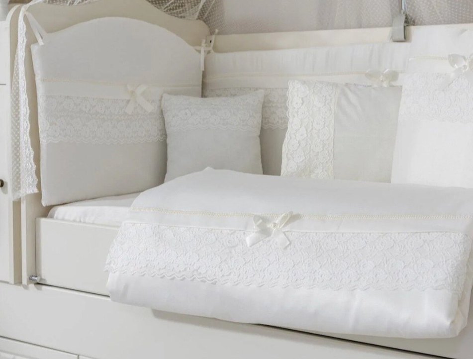 İşlemeli detaylar ve zarif dantel desenleriyle süslenmiş, küçük fiyonk detaylı bebek uyku seti. Yorgan, küçük kare yastık, yatak kenar korumalıkları, cibinlik aparatı ve tülünden oluşan bir set. (SETE ÇARŞAF DAHİL DEĞİLDİR.)