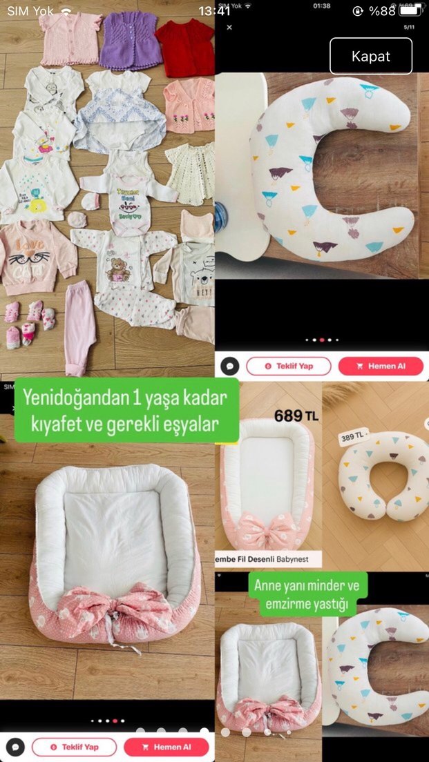 Fil desenli babynest ve ay şeklinde emzirme yastığı içeren bebek uyku seti. Yenidoğandan 1 yaşa kadar pastel renkli yumuşak sentetik kumaş kıyafetler. 500+500 tl şeklinde iki ilanda 1000 tl dir