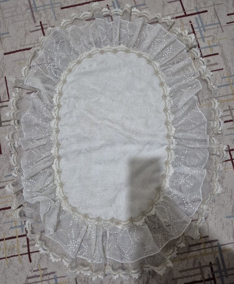 Nakışlı desenlere ve fırfırlı kenara sahip beyaz oval masa örtüsü. Geleneksel tasarımda gri detaylar bulunur.