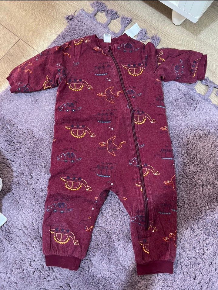 Bordo renkli, fermuarlı ve yumuşak kumaşlı bebek erkek tulumu, sevimli dinozor desenleriyle süslenmiştir. 1 TOG