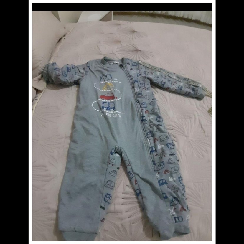Gri renkte, uzun kollu ve yuvarlak yakalı, yumuşak ve sıcak kumaştan yapılmış bebek tulumu. Fermuarlı ve baskılı desenlidir, 2.5tog uyku tulumu civil marka elyaflı