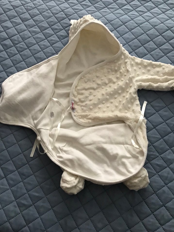 Yumuşak dokulu bebek uyku tulumu, kapüşonlu ve bağlama ipleriyle güvenli kapanma sağlar. Bebeklere sıcaklık ve konfor sunar. krem rengi