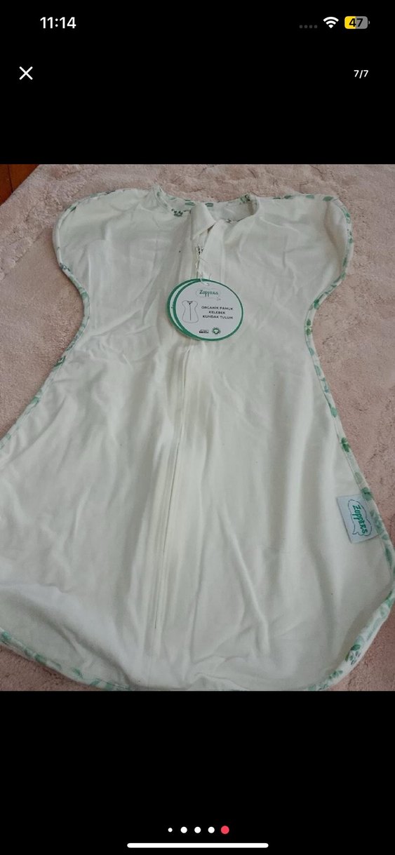 Yumuşak sentetik kumaştan yapılmış, pastel beyaz bebek uyku tulumu. Düz ve sade tasarıma sahip, konforlu uyku için uygundur.