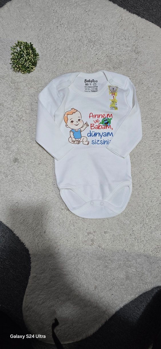 Pamuklu, uzun kollu, düğmeli beyaz bebek body. Renkli baskılı, sevgi dolu Türkçe mesaj içerir. Annem ve babam Dünyam Sizsiniz yazısı vardır çıtçıtlı badi çıtçıtlı zıbın