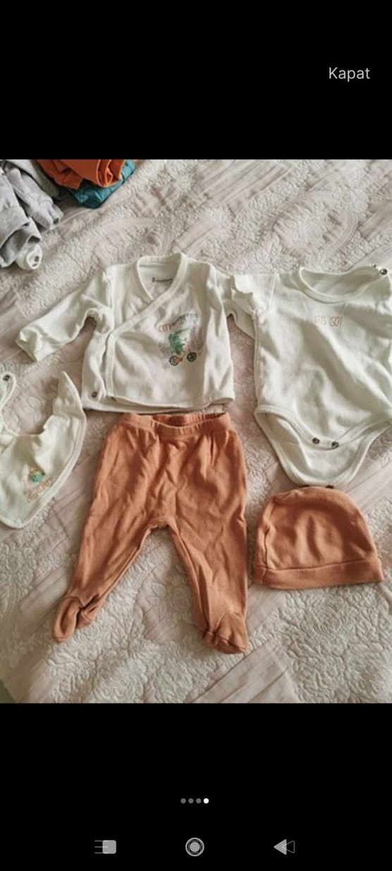 Bebek için uzun kollu beyaz üstler, pastel renk pantolon ve şapka içeren sade ve şık bir set. erkek bebek hastane çıkışı yenidoğan takım az kullanıldı kusuru yok marka temsili #yenidoğantakım #hastaneçıkışı #bebektakım