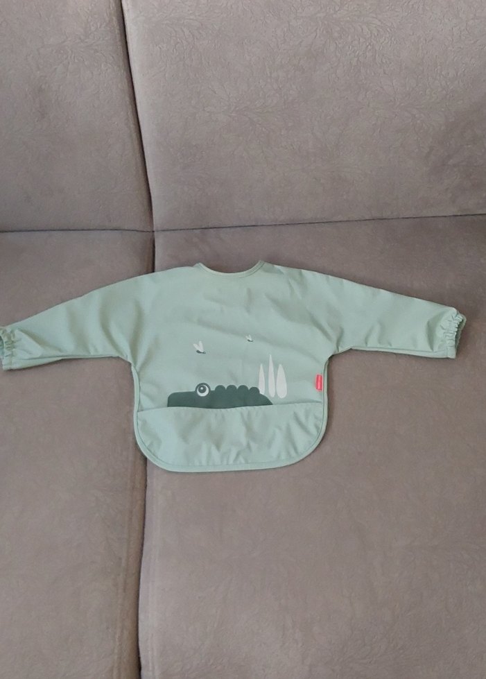 Pastel gri renkte, uzun kollu ve baskılı timsah desenli bebek önlüğü. Lastikli manşetlere ve ön cep detayına sahiptir.