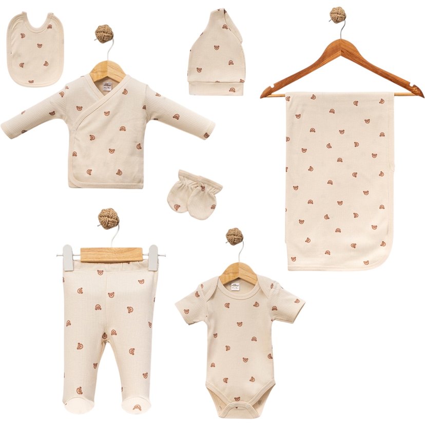 Küçük ayı desenli, uzun kollu kahverengi bebek kız 5'li takım; şapka, eldiven ve battaniye ile rahat ve şık.