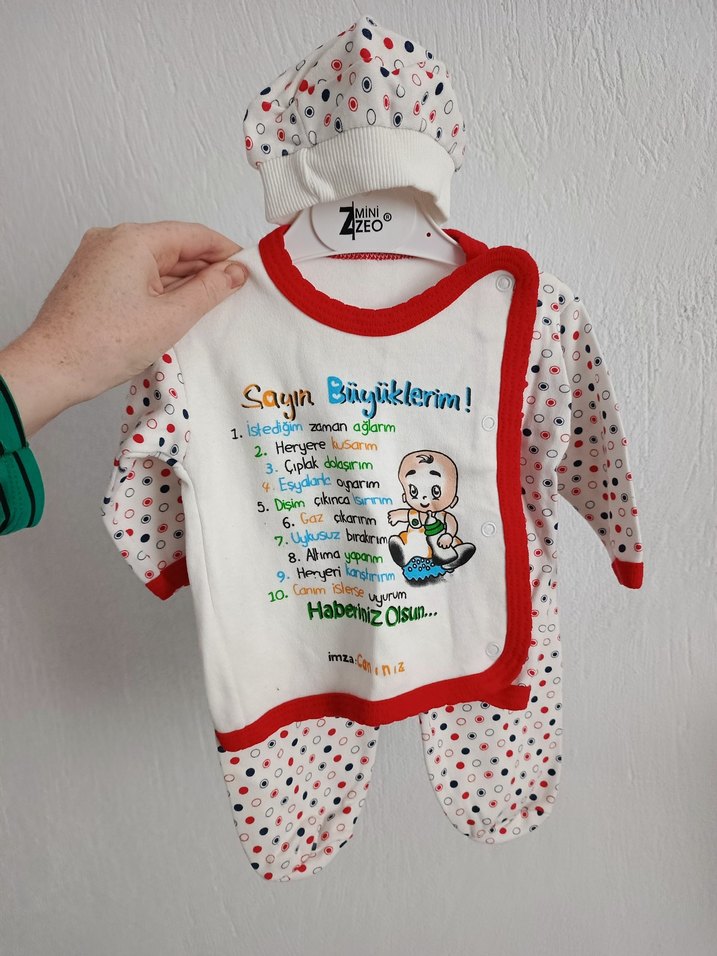 Bebek için pamuklu, uzun kollu ve düğmeli hastane kıyafeti. Renkli baskılar ve uyumlu şapka ile birlikte gelir. Eğlenceli yazı ve çizimler bulunur. 1-3 ay için uygundur
