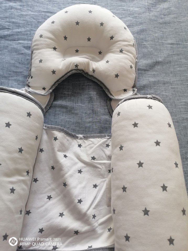 Yumuşak sentetik kumaştan yapılmış, gri yıldız desenli bebek uyku destek seti rahatlık ve destek sağlar. Düz kafa yastığını kendim aldım hiç kullanmadım kiraz çekirdeği Kemeri ve bebek yan yatış yastığını burdan aldım çok az kullandım