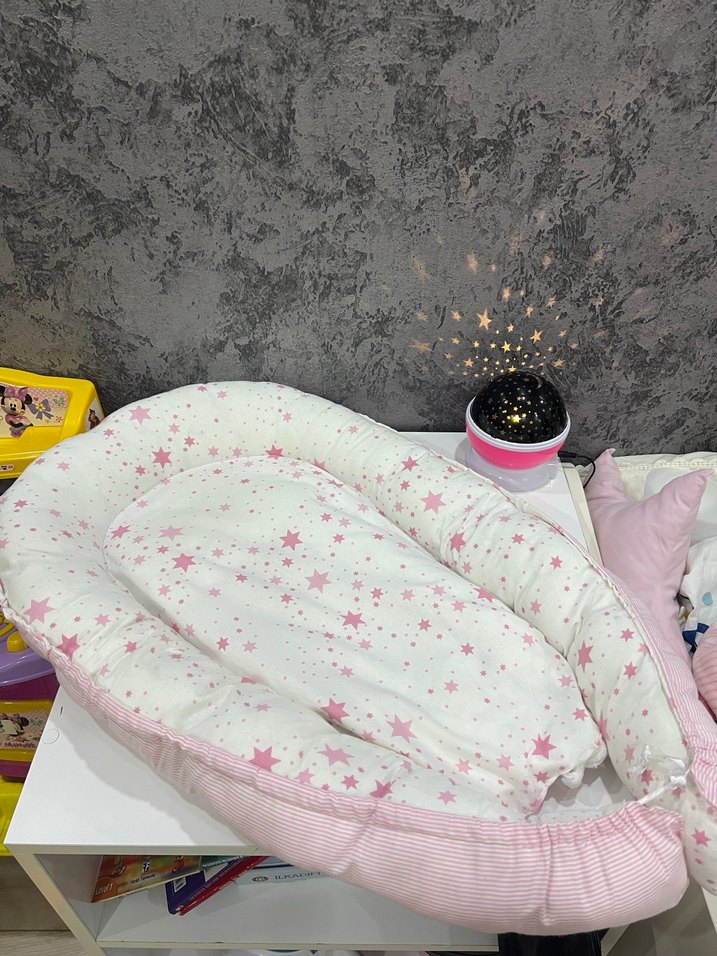 Pastel pembe yıldız desenli, yumuşak sentetik kumaştan yapılmış bebek yatağı, rahat uyku alanı sağlar. Baby nest. Makinede yıkanıyor