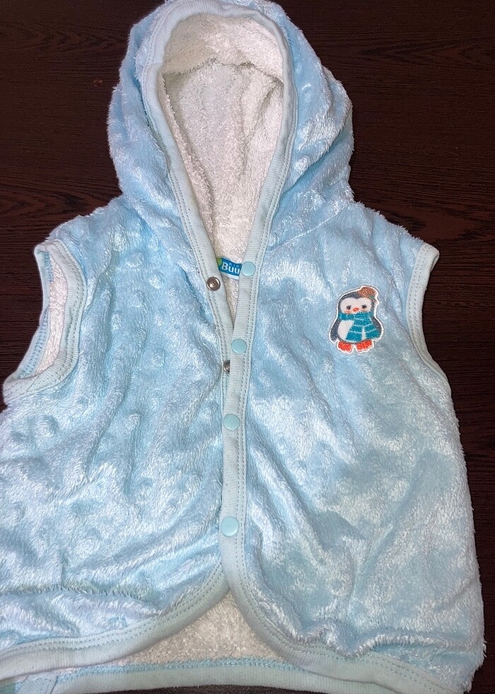 Kışlık kapişonlu yumuşacık mavi renk yelek.6-9 ay için uygun.çok az giyildi hiçbir problemi yok kusursuz
