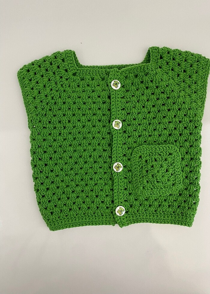 Yeşil renk bebek yeleği 4 adet düğme mevcut alize Coton iple örüldü