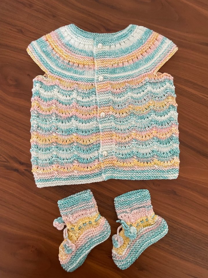 Geçişli düğmeli, bol kesim, nakışlı pastel çok renkli örgü bebek takımı. Bohem tarzda, yumuşak dokulu.