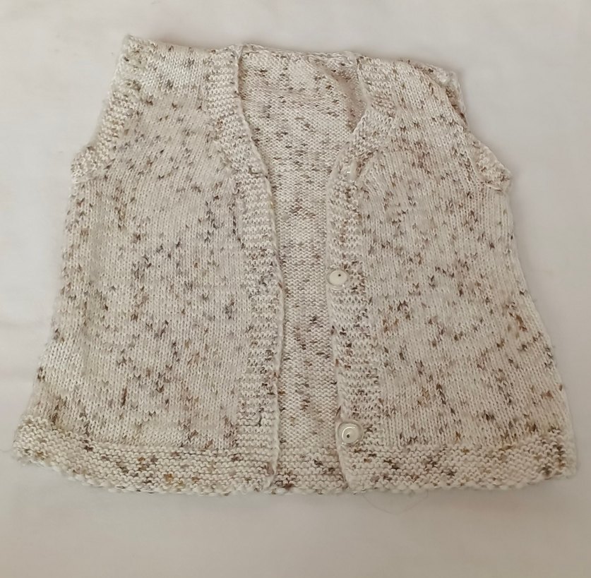 Bej renkli, V yakalı, düğmeli ve kolsuz örgü hamile süveter. Rahat ve bol kesimli, günlük kullanım için uygundur.