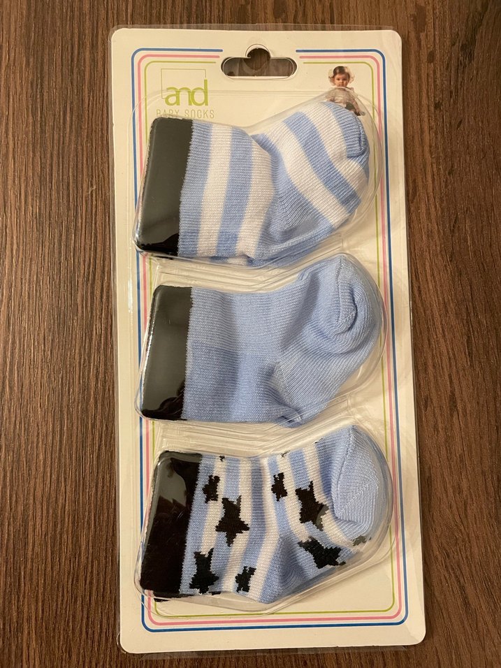 Mavi ve siyah beyaz tonlarda, çizgili ve yıldız desenli üç çift erkek bebek çorabı seti.